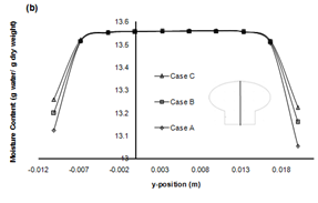 Figure 11 demonstrates the variation of moisture content along the axial direction which pass through the head and stem of the mushroom for different drying temperatures (case A, case B, case C) at various time intervals of 60s, 600s and 6000s, respectively. The negative y‒axis indicate the stem of the mushroom.