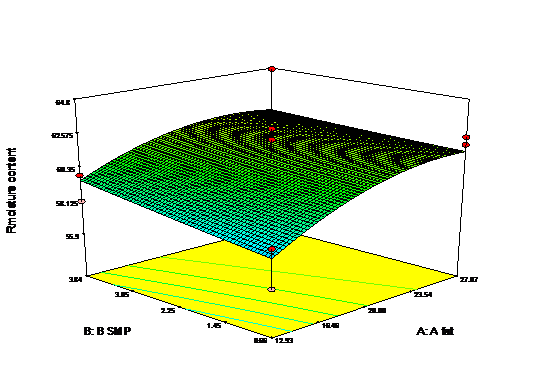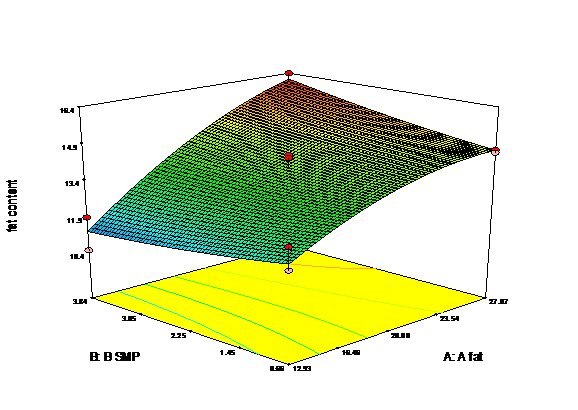 The fat content of fresh sausage were determined and it vary in the range 11.27 % to 15.761%. Figure 5 shows 3D response surface plot, the dependency of emulsion sausage Fat content on fat and SMP.