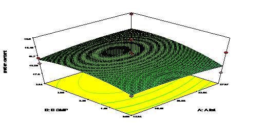 Protein content of emusion sausage is an important characteristic, which relates the quality and shelf life. The protein is the third major class of nutrients. There are thousands of proteins founds in nature which vary in their composition and size. All the proteins contain the elements carbon, hydrogen, oxygen and nitrogen. A good quantity of protein is essential for proper growth. Figure 2 shows 3D response surface plot, the dependency of emulsion sausage protein content on fat and SMP.
