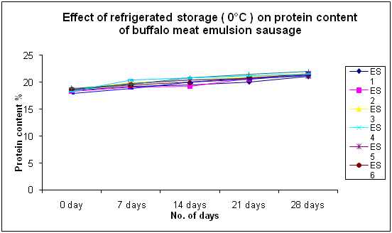 The quadratic model was suggested by the analysis and was found not significant on the analysis of variance at (p>.5460), the quadratic model shows low R2= 0.2437. The coefficient of quadratic term of factors indicates, that the protein content is negatively correlated with fat and SMP. The F value shows that the fat affected more as compared to SMP. Starting from the intial point (A= 12.93%, B= 0.66%) the protein content was found to be 18.27%. Figure 3 shows the protein content profile of emulsion sausages samples during refrigerated storage (0°C). The linear regression of this graph has been shown on the regression graph. The equation of regression lines and correlation coefficients are shown on the regression graphs. The positive sign in the coefficients of x explain that there was slight increase of protein content during refrigerated storage. The correlation coefficient values explain the correlation between protein content and storage days. The increasing nature of protein content with storage time was perfect at R2=1, the values of R2 for all samples were found near 1 which shows that correlation are almost perfect and the graphs may be approximated to a straight line.