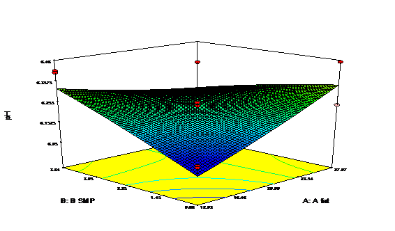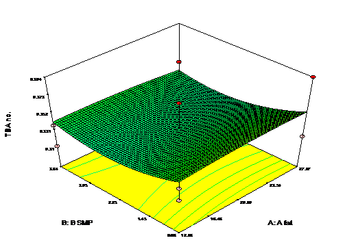 The quadratic model was suggested by the analysis and was found not significant on the analysis of variance at (p>0.5930), the quadratic model shows low R2= 0.2266. The coefficient of quadratic term of factors indicates, that the TBA number is positively correlated with fat and negatively correlated with SMP. The F value shows that the fat affected TBA number more as compared to SMP. Starting from the intial point (A= 12.93%, B= 0.66%) the TBA number was found to be 0.326. Figure 7 shows 3D response surface plot, the dependency of emulsion sausage TBA on fat and SMP.