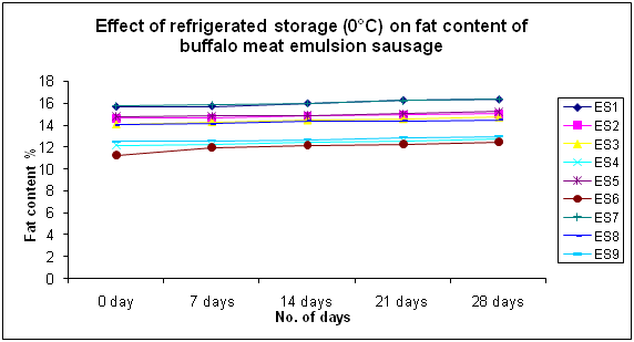 There is comparatively increase in fat content of sausage samples during refrigerated storage (0°C) due to the decrease in moisture content of emulsion sausage. Fat content of emulsion sausage is evaluated before and during refrigerated storage at 0°C. Figure 6 shows the fat content profile of emulsion sausages samples during refrigerated storage (0°C). The linear regression of this graph has been shown on the regression graph. The equation of regression lines and correlation coefficients are shown on the regression graphs. The positive sign in the coefficients of x explain that there was increase of fat content during refrigerated storage. The correlation coefficient values explain the correlation between fat content and storage days. The increasing nature of fat content with storage time was perfect at R2=1, the values of R2 for all samples were found near 1 which shows that correlation are almost perfect and the graphs may be approximated to a straight line.