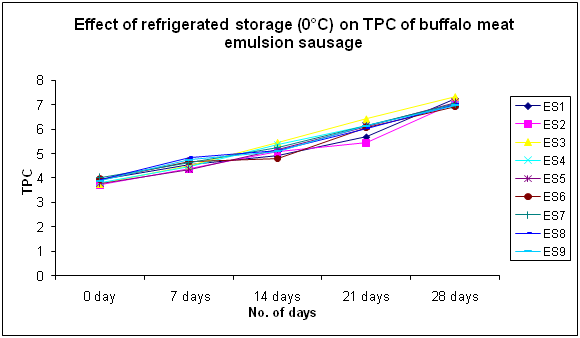 The total plate count of emulsion sausage was found in the range between 3.72-4.02 in fresh condition. After 28 days of refrigerated storage (0°C) the values of TPC of emulsion sausage samples was ranged in between 6.97 -7.245 log cfu/g, this indicated the spoilage condition of emulsion sausage samples. The storage study revealed that the sausage samples came to spoilage end after 28 days of refrigerated storage. It was measured by the total plate count of these samples. Therefore shelf life of the samples was found to be 21 days under refrigerated condition (0°C).
