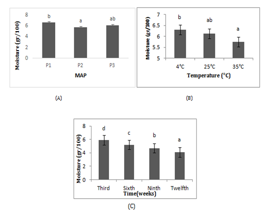 Figure 1 Effect of MAP (A) storage temperature (B) and storage time (C) on the moisture amount of saffron. Different superscripts indicate significant differences at (p ˂ 0.05) and error bar represent standard deviation.