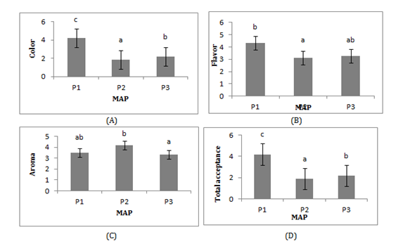 The sensory evaluation of saffron samples during the storage time are shown on Figure 2. In terms of colour, samples showed clear differences with different MAPs. A brilliant red colour similar to the control samples was observed with MAP1 (100 % N2). Saffron with MAP2 (40% N2 + 60 % CO2) also had dark brown colour and there was a combination of dark red to brown colour with MAP3 (60% N2 + 40 % CO2) (Figure 2A). Thus, it is confirmed that the quality of external saffron colour steadily increased over time with MAP1 (100 % N2). Regarding flavour, MAP1 (100 % N2) showed the best flavour and came closest to the control samples. The lowest intensity of flavour was obtained with MAP2 (Figure 2B). The highest intensity of aroma was also obtained with MAP2 (Figure 2C). The total acceptance of saffron samples with MAP1 and MAP2 corresponded to the highest and lowest ranks, respectively (Figure 2D). Saffron color was the most important factor regarding the interest of consumers.