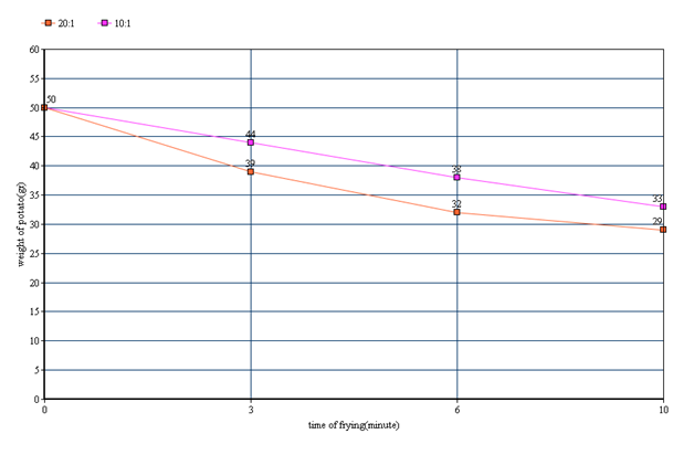 Changes of weight of potato, temperture of oil with time of frying were plotted, thickness of crust and thermal conductivity coefficient (K) were measured. These experiments were done for ratios oil to potato 20, 10 separately.