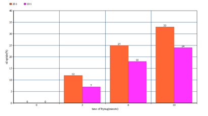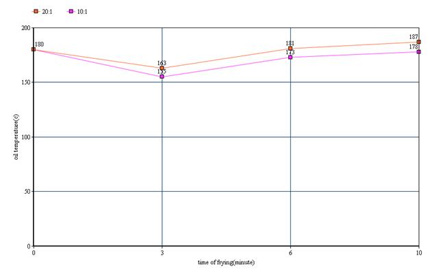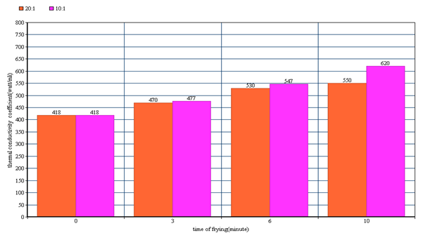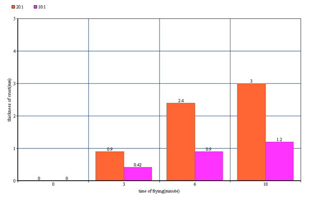 We found for two sizes of french fries potato that there was significant difference (p<0.05) among two ratio oil to potato in items of % loss water (Figure 1).the highest % loss water was ratio 20 and the lowest was ratio 10, our results revealed that percent of oil at ratio 20 and 10 were 33 %and 24% respectively. As it can be seen in Figure 1, loss weight of potato at time 10 minute was 42 % and 34 % for ratio 20 and 10 respectively. This different were significant (p<0.05). Temperture of oil were after 10 minute of frying 187 °C and 178 °C for ratio 20:1 and 10:1 respectively and this different was significant(p<0.05)7 (Figure 2). Considering thermal conductivity coefficient analysis were observed difference significant between ratios 20 and 10 (p<0.05). That values were 620 and 550 wat/c sec for ratios 20 and 10 respectively (Figure 3). Results showed thickness of crust were significant for ratios that values were 3 and 1,2 mm for ratio 20 and10 respectively8 (Figure 4). At last, oil uptake % were 33 and 24 for ratio 20 and 10 respectively thus ratio 10 was suitable for frying of potato (p<0.05) (Figure 5).