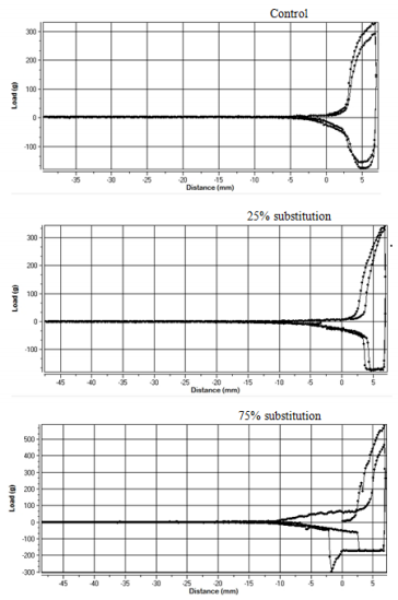 Spread ability of chocolate spread is the most texture property affecting its acceptance. The spread ability explained as hardness which is amount of the force using to penetrate the probe of Brookfield apparatus the sample. The spread ability has an opposite correlation with hardness value. Table 2 showed the hardness values (g) of the three experimental samples which recorded the highest hardness in cycle 1 and 2 was the sample which contain 25 % eggplant puree then 75% and finally whole butter sample. The degree of adhesiveness (mJ) was the highest in control sample then 25 % and the lowest one was 75% the degree of decrease was reached to the double between each sample that may explain the distribution of emulsion particles in each sample which affecting by samples composition, mixing technique and processing method. The springiness length (mm) was the highest in 25% followed by control and 75%, respectively. The gumminess (g) and chewiness (mJ) were the highest in substitution of 25% eggplant puree 510 g and 85.4 mJ, these values in 75% sample were 252 g and 14.8 mJ and finally, the control one values were 133g and 17.4 mJ. Figure 1 showed the deformation of samples in cycle 1 and 2 and we noticed that the deformation was the highest in 75% substitution sample and the lowest in the control one that may refer to the degree of adhesiveness in the samples.