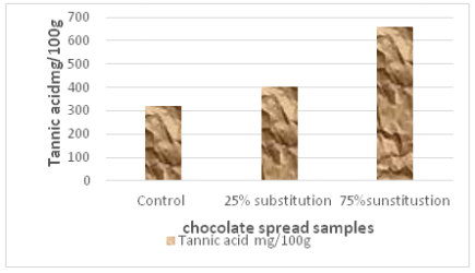 Tannic acid content and antioxidants activity: HPLC System Agilent using to determine tannic acid in the three chocolate spread samples, in this method 10 mg sample was dissolved in 10 ml of mobile phase (Methanol: Water (50:50)) and the extract was injected in apparatus with pump LC-P-100, detector LC-UV-100 UV/VIS, detector column temperature ambient and wavelength of detection 270. The chromatographic conditions for analysis were flow rate 1mL/min, sample volume 20 µL, run time 12 min and retention time 3.1 min. The quantification of tannic acid was calculate using an absolute calibration curve method using standard solutions of tannic acid.29 Radical scavenging activity of chocolate spread sample was measured using the DPPH (2, 2-diphenyl-1-picrylhydrazyl) according to Brandwilliams et al.30 The determination of DPPH scavenging for chocolate spread sample using 1mM solution of DPPH in ethanol and also 1mg/1 ml extract solution in ethanol was prepared and 1.5ml of this solution was added to 1.5 ml of DPPH. The absorbance was measured at 517 m against the corresponding blank solution which is prepared by taking 3ml ethanol and control O.D. was prepared by taking 3ml of DPPH. The assay was performed in triplicates. Percentage inhibition of free radical DPPH was calculated based on control reading by following equation