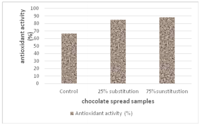 As shown in Figures 2 & 3, the tannic acid content and antioxidant activity of the three samples of chocolate spread. It was found that both values increased with increasing the ratio of eggplant puree which was a good source of polyphenols which act as antioxidants. The tannic acid contents were 318.92, 401.28 and 661.46 mg/100g for control, 25% and 75% samples, respectively. That was paralleled with the antioxidant activities of the three formulas which the 75% eggplant puree formula was also the highest in its antioxidant activity (88.22%) then 25% eggplant puree formula (84.75%) and finally, the lowest one was the control chocolate spread (66.59%). Stommel & Whitaker42 showed that eggplant is consider one of among the ten best vegetables by its ability to absorb oxygen radicals because of its high content of phenolic compounds. Flavonoids, phenolic acids and polyphenols are the main classes of dietary phytochemicals, phenolic polymers, commonly known as tannins, are compounds of high molecular weight that are divided into classes, hydrolysable tannins and condensed tannins and they found that eggplant fruit phenolic content provide opportunities to improve eggplant quality and value and they reported that about of 64.3%to 96% of total hydroxycinnamic acids HCA was chlorogenic acid. Also, they illustrated that vegetables have antioxidant quality comparable to that of pure phenol and superior to that of antioxidant vitamin A, C and E.