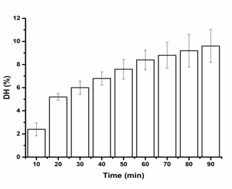 Results indicated that all the ultrasound pretreatment did not progress the DH rate which are fall in range 9 to 12 %. The effects of dual frequency ultrasound of two combinations frequency containing 20/28 kHz on the DH of SP resulted value 9.6 % as presented in Figure 2. The degree of hydrolysis of SP went up when the enzymolysis just in progress. As the enzymatic reaction time went on, the degree of hydrolysis has a tendency to be consistent. This may be because that ultrasound pretreatment can destroy partial tight protein structure and makes the protein buried inside primarily expose. This outcome in further effective substrate for the enzyme to interaction the cleavage site when the enzymatic hydrolysis began. Anyway, the DH of SP tends to be consistent with the decrease in the available cleavage site afterwards. And this result is consistent with the result of many literatures.24,25