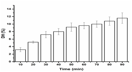 Figure 2 Effects of time on the DH of SP, ultrasound pretreatment with dual frequency 20/28 KHz, enzymatic reaction at 50°C and pH9.