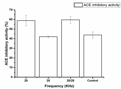 Figure 4 showed the effects of the single frequency ultrasound pretreatment 20 KHz and 28 KHz, as well as showed dual frequency ultrasound pretreatment 20/28 KHz operating at on the ACE inhibitory activity of SP hydrolysate. The ACE inhibitory rate of SP pretreated by ultrasound with dual frequency ultrasound 20/28 KHz had no significant difference compared with that of 20 kHz (Figure 4) the results That of dual frequency ultrasound with frequency combinations of 20/28 kHz presented higher than other frequency compared with control and two others single frequencies 20 KHz and 28 KHz. It indicated that the ACE inhibitory activity improved significantly by the dual frequency ultrasound compared with the single frequency and control sample. It can be concluded from the results that all the ultrasound pretreatment effected the ACE inhibitory activity of SP hydrolysate. All the ultrasound pretreatment effect on ACE inhibitory activity of SP hydrolysate significantly. The results showed that the ACE inhibitory activity of SP pretreated by 20,28 and 20/28 kHz ultrasound frequency increased by 34.36%, 4.11% and 36.14% respectively, compared with control. The highest ACE inhibitory activity was obtained under 20/28 kHz ultrasound frequency. This result indicated that compared with other ultrasound frequency, 20/28 kHz ultrasound frequency might have generated the change in protein structure which was more suitable to the subsequent enzymatic hydrolysis for preparation of ACE inhibitory peptide.