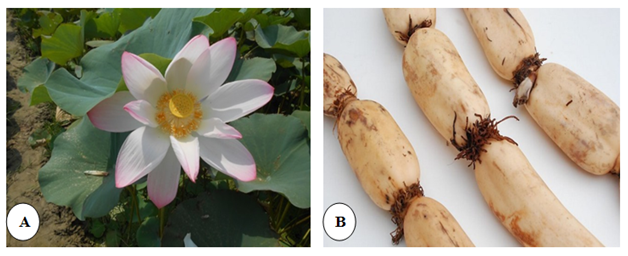 The present study was carried out to evaluate the phytochemical, ethnomedicinal and nutritional analysis of N. nucifera rhizome. Phytochemicals were extracted from N. nucifera rhizome using different solvents like methanol, acetone, and chloroform. The proximate parameters like ash, crude fat, crude fiber, crude protein, carbohydrates, moisture contents and energy values were obtained using the Association of Official Analytical Chemists (AOAC) methods. Descriptive research design was adopted in this study. Different parts of the N. nucifera (A) whole plant and (B) rhizome is shown in Figure 1.