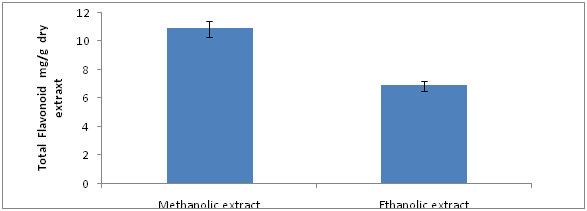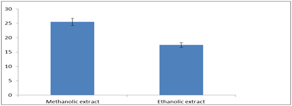 The estimation of total flavonoid content was determined from the calibration curve of Rutin and expressed as (mg) of Rutin Equivalent per gram of extract. In the current study the total flavonoid contents were found to be higher 10.84±0.16 RUE mg/g in methanolic extract, whereas in ethanolic extract the flavonoid content was low 6.86±0.76mg RUE/g respectively (Figure 5). According to another study total amount of flavonoids in methanolic extract was found to be 41.86mg QE g of dry extract. In similar studies the total flavonoid content of N. nucifera stem extract was found to be 77.8mg Rutin equivalent/100ml for ethanolic extract.19