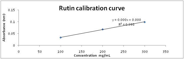 Determination of total flavonoid content: Total flavonoid content was estimated according to the method of11 with some modification using rutin as a standard. Rutin (100 to 300mg) was dissolved in methanol. Then, the stock solution was diluted to provide a series of concentrations. To this 150µl of 10% aluminum chloride and distilled water was added. Then 100µl 1M potassium acetate, 200µl extract was added. They were incubated for 40minutes in dark at room temperature. The absorbance was measured at 430nm.