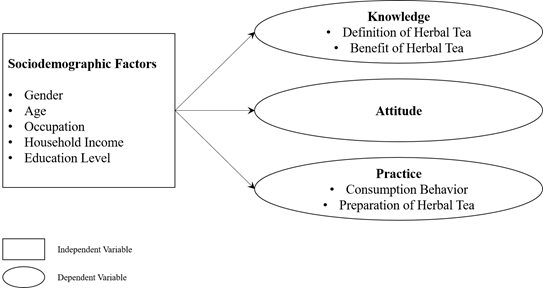 Figure 1 is a conceptual framework which shows the variables in this study. The rectangle shape indicates the independent variables which are gender, age, occupation, household income and educational level whereas oval shape refers to knowledge, attitude, and practice as the dependent variable in the study. There are significant association between demographic profile and knowledge level of consumers and between demographic profile and herbal tea consumption practices of consumers. Whereas there is a significant difference between demographic profile and attitude level of consumers towards herbal tea consumption.