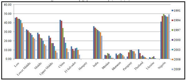 Food insecurity is consequence of poverty and low accessibility of population to acquire food according to their need. Poverty is significant cause for food insecurity,9–11,15,47 it is the prime cause of hunger and at the same time hunger is the cause of poverty and under nutrition. Figure 1 show the poverty situation for different economies of the world. India and Nigeria count largest number of undernourished person due to high and chronic poverty. It also make the comparison of India’s food security as compared to China, EI-Salavador, Hungry, Mexico, Morocco, Paraguay, Thailand, Ukraine and Nigeria. India is in alarming position in food insecurity due to chronic poverty as compared to other larger agrarian economies like China, Brazil and Thailand.5,9,40,48