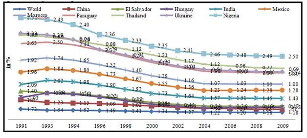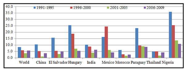 Increasing food prices is also another cause for food insecurity, hunger and poverty in most developing countries like India, Bangladesh, Pakistan and Thailand.5,9–11,22,38 In developing countries a large portion of poor people spend a large share of their income on food and any price hike has negative impact on their food consumption level. However, most developing countries are in food insecurity trap due to lower cereal productivity and per capita availability of cereal.11,48 Hence, agriculture is considered as a best estimator for food security as it reduce malnutrition level, hunger and poverty for small scale farmers who undertake cultivation at subsistence and marginal level.9,48 High variability in food price is caused to decrease ability of poor people to move out from poverty and food insecurity would be in serious position due to high poverty. Adenegan et al.,49 observed that instability in food prices is a potential problem for food insecurity in Nigeria. Faridi et al.,37 witnessed that food price is one of the most significant factors for reducing household's food security in Bangladesh. Figure 2, indicates the consumer price inflation rate of various economies. The average inflation rate are higher in developing countries than developed economies during 1996-2009. Therefore, developing economies like India and Nigeria are in food insecurity trap.48