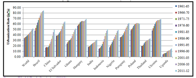 Additionally, rapid urbanization has a negative implication on food security.9–11,26 Urbanization is creating another form of acute hunger in most of developing regions like India and China.28,48 Fertile arable land is using for non-agricultural purpose (i.e., building, roads, houses construction and factories) due to rapid urbanization and industrialization. Thereby food-grain area and food-grain production has decreased at global level.9,50,51 Also, it has been evident that global area under pulses has decreased from 5 million hectare in 1968 to 3.9 million hectare in 2007. Consequently, consumption of pulses in terms of kcal/capita/day is also declined due to urbanization and industrialization during 1968-2007.22 Figure 4 specifies the urbanization rate for different countries. Brazil, EI- Salvador, Ghana, Hungry, Indonesia, Nigeria, Paraguay, Ukraine and Uganda have a higher urbanization. So, urbanization has brought negative implications on food security in these economies.