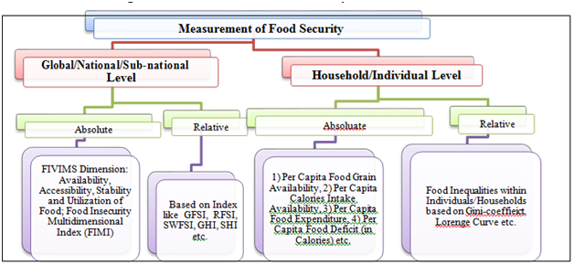 Figure 5 shows the details of several methods to evaluate the food security at different levels. It infers that food security can be estimated through absolute and relative level, while different techniques like FIVIMS dimension, multidimensional index, GFSI, RFSI, SWFSI, GHI, SHI, per capita food-grain availability, per capita calories intake availability, per capita food expenditure, per capita depth of food-deficit, etc. may be used to estimate the food security at global/national/sub-national/household/individual level in an economy.56