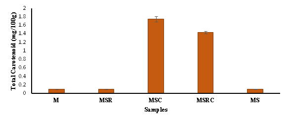 Total β-carotene content: The β-carotene of developed breakfast cereal ranged from 0.0041mg/100g (M) to 1.75mg/100g in (MSRC) (Figure 1) respectively, the total carotenoid content increase with increased carrot pomaces which may be as a result of carrot pomance is a by-product rich in β-carotene, a precursor of vitamin A. This increased content of β-carotene is beneficial as this may reduce the risk of night blindness and poor immune system. However, the finding of this present study is low compared to 100% carrot pomance value reported by Alam et al.57 and this may be due to low proportion of the carrot pomace added to the flour used in developing breakfast cereal meal.