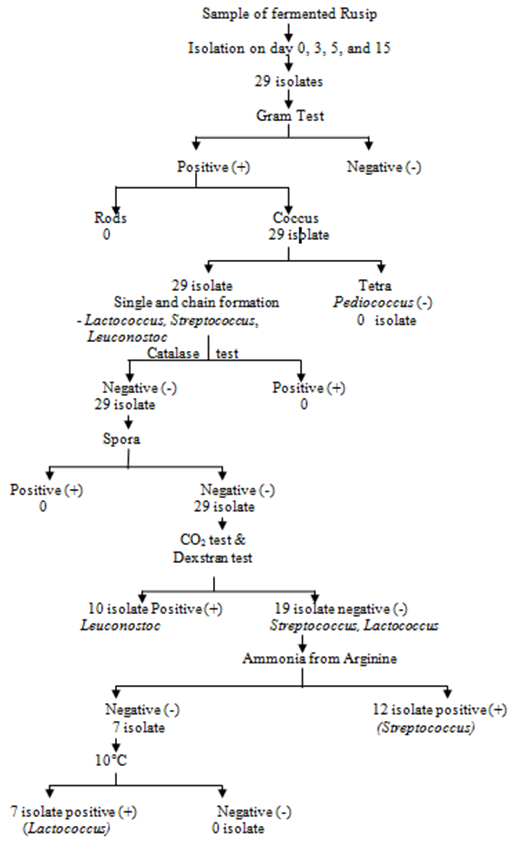 The results of testing the biochemical properties to determine the genus of lactic acid bacteria of 29 isolates can be seen in Table 2 and the spread of LAB at each fermentation periode is presented in Table 3 while the determination scheme can be seen in Figure 1.
