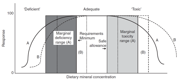 The following Figures 1, 2 &3 are shownthat the relationship between mineral supply and animal production. It shows also marginal bands between adequate and inadequate or toxic dietary concentrations. The graph and marginal ranges move to the right as absorbability of the mineral source declines; thus “A” represents the more and “B” (dashed line) the lesser absorbable of two mineral sources.29–32 ‘Requirements’ are variously set within the central adequate band from minimum requirements to safe allowances, depending on the extent to which absorbability and other variables are taken into consideration.