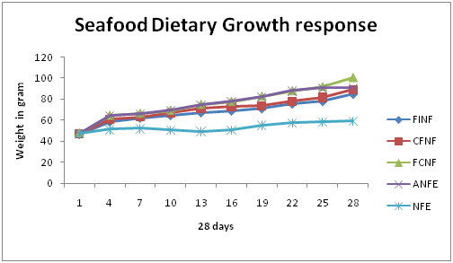 Seafoods dietary were excellent source of minerals such as calcium, iron. Zinc, potassium iodine, phosphorus, selenium, omega-3 fatty acids and omega-6 fatty acids wish are vital to Elderly and Pregnant women. Seafood prominently includes fish and shellfish, various species of mollusks, crustaceans, and echinoderms. The purpose of present study was to nutritional established and compared seafood such as fish and crayfish supplement dietary. The investigated recipe consisted of dietary formula 10%Fish+Nitrogen free diet(FINF), 10%Crayfish+Nitrogen free diet (CFNF), 5%Fish5%Crayfish+Nitrogen free diet(FCNF), Control diet(ANFE) Nitrogen free diet (NFD). The following parameters such as chemical composition, Nitrogen retention, Animal Bioassay and internal organs, were taking into consideration. The result revealed that there were growth responses in dietary were progressive in growth for FINF (46.55g-77.93g), CFNF (47-81.86g), FCNF (46.68-87.67g), ANFE (46.60-87.62g) respectively but NFE (59.08-47.46g) dietary is decline in growth. Similar trend were followed by nitrogen retention, biological values, chemical composition, Nitrogen retention, Bioassay, internal organ. In conclusion Sea foods dietary promoted the rate of growth responses; biological values were comparable to that of white egg. Also, Seafoods experimented diets proved to be an excellent source of minerals which include calcium, iron, zinc, potassium iodine, phosphorus, selenium and omega-3 fatty acids wish are vital to Elderly, Pregnant women, feuto brain development and survival to their body growth. Seafood have better performance with elated attributes, could be used to combat depression, protein-energy malnutrition such as kwashiorkor and marasmus.