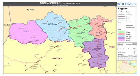 Tigray region is the northern most of the nine regional states of Ethiopia. Its capital is Mekelle. Tigray is bordered by Eritrea to the north, Sudan to the west, the Afar region to the east, and the Amhara region to the south and southwest. Besides Mekelle, other major cities in Tigray includes AbiyAddi, Adigrat, Adwa, Axum, Humera, Korem, May chew, Qwiha, Shire (India Selassie), Wukro and Zalambessa, as well as the historically significant town of Yeha.12