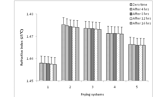 Figure 1 shows the refractive index values for non-fried and fried olive oil, sunflower oil and their blends (60:40, 40:60 and 80:20 v/v). The values demonstrate that olive oil refractive index value was lower than that of the refractive index of sunflower oil and blend oil samples. There is a strong relationship between the refractive index and iodine value, with higher iodine values would have higher refractive index and this fact is in line with data of the present work. The value of refractive index of fried olive oil, sunflower oil and blends of them indicate a linear relationship between their refractive indices and frying period. The increase of the refractive index values over frying time for the oil systems was in the order: sunflower oil ˃ olive oil+ sunflower oil (40:60) ˃ olive oil + sunflower oil (60:40) olive oil + sunflower oil (80:20) ˃ olive oil. This sequence is in line index values for the conjugated compounds are higher than that of their non-conjugated isomers. It is established that during oil frying some of the non-conjugated double bonds are converted to conjugated ones and this process cause an increase in the refractive index value.19