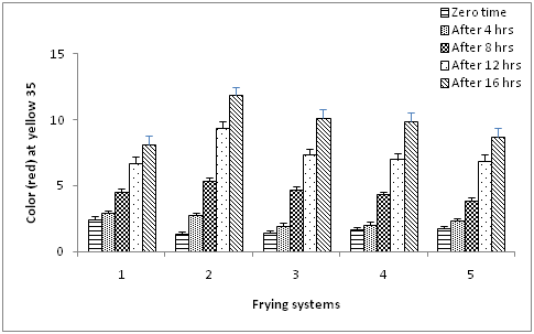 In most cases, two types of colored glasses of Lovebird Tintometer, i. e., yellow and red, were used to measure the color of the oils. The yellow glasses were fixed at a value of 35 and the variation in oil color was matched with red glasses. Figure 2 illustrate that the initial red colors for olive oil and sunflower oil were 2.20 and 1.70, respectively. As a general trend, the intensity of the red color in all oil systems was increased as the frying time increased. Accordingly blending sunflower oil with olive produced lighter frying media.