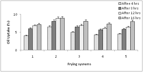 Figure 8 Oil uptake of fried potato chips during frying experiment using blended olive oil. Values are expressed as mean ±SE, P ≥ 0.05.