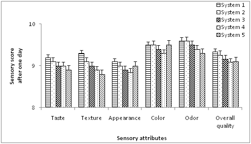 From the sensory mean scores on the day 1, there were significant differences (P ≥ 0.05) in terms of color, odor, taste, appearance, texture and overall quality in all samples (Figure 9). In day 4, the samples indicated that there was no significant difference in color, odor, appearance, while there was a significant differences (P ≥ 0.05) in texture, taste and overall quality in all samples (Figure 10). Throughout this study, the addition of olive had affected the consumer perception on the fried potato chips. The sensory data generally showed that fried potato chips in olive oil were of significantly different (P ≥ 0.05) from fried potato chips in sunflower oil.