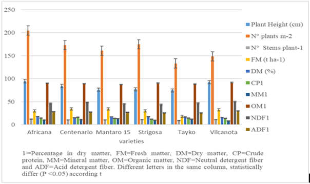 In Table 2, the variables are being studied for each of the varieties of oats. No significant differences (P> 0.05) were observed between varieties for plant height, number of plants m-2, number of Stems plant-1, production of FM, nor for DM.