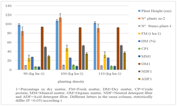 The soil was selected and mechanized prepared before soil analysis. Then, the sowing was done through broadcast sowing. The parameters evaluated were plant height, number of plants per m2, and number of Stems per plant. Plant height was measured in 5 samples per experimental unit. The number of plants was measured in 4 samples, each sample had a frame of 0.06 m2. The number of Stems per plant were measured in 5 samples. The fresh matter yield (FMY) of 4 sub samples of 0.25 m2 were taken in each experimental unit considering an edge effect of 30 cm.10