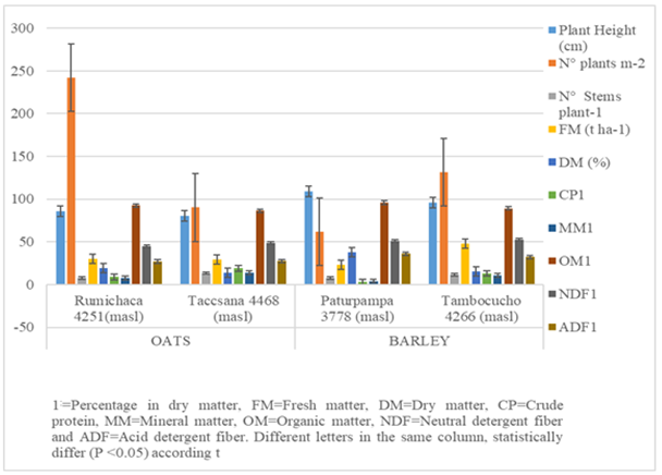 Oat (Avena sativa L.) is a grass commonly used as winter forage in the high Andean region, and they are commonly used to feed cattle5 mainly due to the high concentration of fermentable carbohydrates.6 Despite their high nutritive composition,7 local cultivars have not favorable characteristics such as small grain, regular foliage, and high disease susceptibility.8 However, it is a crop that adapts to different environmental conditions, altitudes, and managements.9