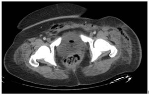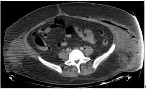 Figure 1 CT scan prior to second intervention that shows subcutaneous emphysema and what it seems and abscess formation.