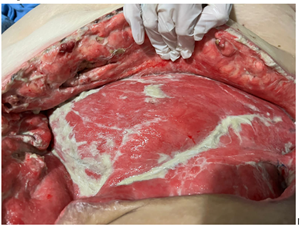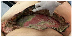 A 43-year-old female with morbid obesity (BMI 42), a history of type 2 diabetes diagnosed 12 years ago without treatment or follow-up, one cesarean section in 2011 and bilateral tubal occlusion in 2018. Who begins with sudden pain in the left inguinal region associated with swelling. She received analgesic treatment without improvement and decided to attend the hospital where is diagnosed with septic shock secondary to soft tissue infection. The results of the blood cytometry were leukocytes 21 000/mm, neutrophils 89%, lymphocytes 6%, hemoglobin 9 mg/dL, hematocrit 28%, and platelets 21 000/mm. Surgical drainage was done and a vulvar abscess was found, dissecting from the mount pubis to the ischiopubic fossa with necrotic tissue and fetid purulent material. During her postoperative period, she continued with purulent secretion outflow; a tomographic study showed the presence of fluid between the subcutaneous cell tissue and the muscular abdominal wall associated with subcutaneous emphysema (Figure 1 & 2). A reintervention was decided for surgical debridement and lavage, among the findings were: labile tissue with fetid necrotic edges, purulent secretion from the left genital area, inguinal region, abdominal subcutaneous cell tissue to the external oblique aponeurosis (Figure 3). In the postoperative period, multiple surgical lavages and debridements were carried out, followed by a VAC system. Nutritional parameters were below the acceptable level, parenteral nutrition was started and enteral nutrition with arginine boluses. A curve of nutritional parameters (albumin, prealbumin, ferritin and transferrin) was made prior to the establishment of the VAC system (Figure 4 & Table 1).