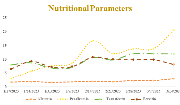 Table 1 This table shows the the levels of nutritional parameters on different dates of hospital stay. Albumin levels are recorded in mg/dL, prealbumin in mg/dL, transferrin in mg/dL¹º and ferritin at ng/dL¹ºº