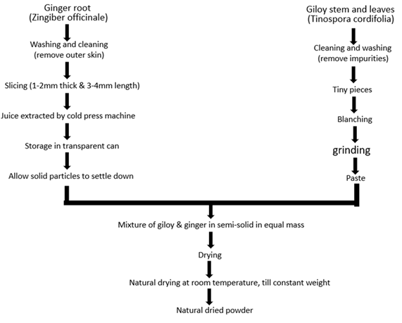 Figure 1 Procedure to make Natural Dried powder of Giloy and Ginger paste. Ginger and giloy powder were placed in an air-tight container and stored in the refrigerator till further analyses.