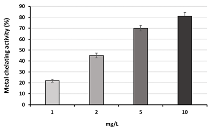Metal chelating activity = (Acontrol – Asample)/ Acontrol x 100