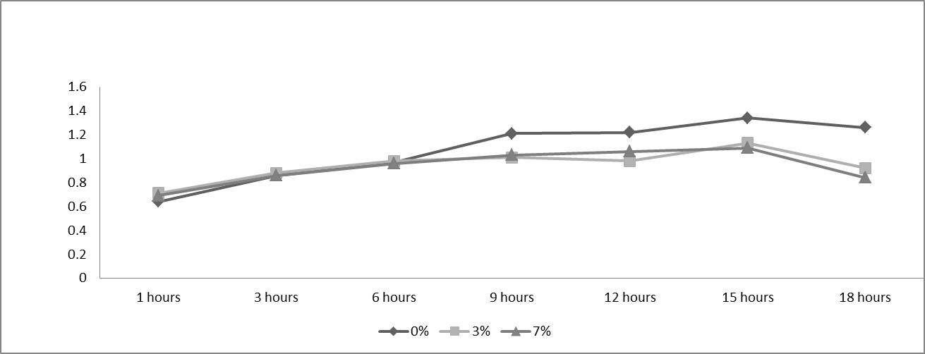 Figure 1 showed the acidity development of yoghurt during incubation period. The fermentation time take about 16-18 hours. This result supported the previous reports that indicated also long time (about 16 hours) for camel milk coagulation.10,13,16,18,28-30 The antimicrobial factors associated with both camel milk and papaya pulp might be the reason for this long coagulation time. Similarly the long length of coagulation time was attributed to the presence of growth inhibitors in camel milk that decreased the activity of lactic acid bacteria during fermentation.31,32 The reduction in lactic acid starter culture was demonstrated previously.10,28,29 This because of the high antimicrobial components content in camel milk (lactoferrin, lysozyme and immunoglobulins) compared to milk from cows or buffalos.33