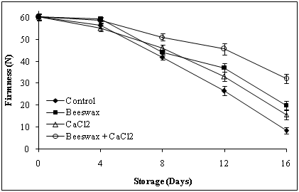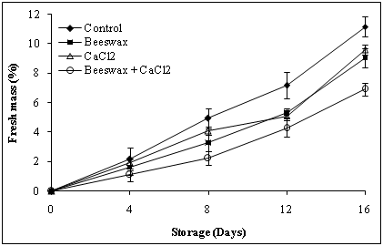 The combination of beeswax and calcium chloride (CaCl2) resulted in fruits with less loss of fresh mass (6.93%) and greater firmness (32.18N) compared to the other treatments (p<0.05) over 16 days, especially in control fruits where the loss of mass reached 17.11% and the firmness was less than 10N for the same storage period (Figures 1), respectively.