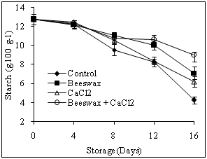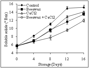 There was an increase in soluble solids (SS) (Figure 2A) and a reduction in the starch content (Figure 2B) with the storage time and in all treatments. Fruits treated with the combination (beeswax + CaCl2) resulted in less SS accumulation (11.98 ºBrix) and higher starch content (8.98 g.100 g-1) after 16 days differing (p<0.05) of the other treatments, especially of the control fruits that presented higher SS (15.21 ºBrix) and starch degradation (4.27 g.100g-1).