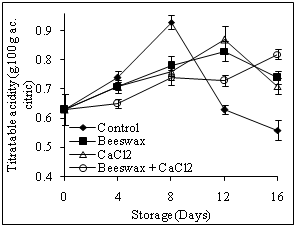 The coating with 3% beeswax (w/v) followed the methodology described by Rodrigues et al. (2014).20For that, 3g of beeswax was weighed, placed in a beaker and taken to a water bath at 100ºC for 10 minutes until liquefaction. Then 5% (v/v) of Tween 80, 0.3% (v/v) of sunflower oil and 1000 ml of distilled water heated to 70ºC were added. The components were homogenized in ultra turrax for approximately 2 min at speed 10 and then the emulsion was filtered through TNT (non-woven fabric). The pH of the solution is adjusted to 5.6 with 1mmol L-1 NaOH using pH meter. When the solution reached room temperature (±25ºC) the fruits were immersed. The 3% (w/v) calcium chloride solution was prepared by dissolving 3 g of CaCl2 in 100 ml of distilled water. The solution was stirred for 30 min using a magnetic stirrer (model SP 18420-26 Barnstead Thermolyne 2555 Kerper Boulevard Dubuque, USA) and 0.2 mL of Tween 20 (Sorbitan Polyoxyethylene Monoleate, Sigma-Aldrich) was added to the solution to improve plasticity. For the combined treatment (beeswax + calcium chloride), the 3% CaCl2 solution was incorporated with the 3% beeswax solution, stirred for 30 min and the pH of the solution adjusted to 5.6 with 1 mmol L-1 NaOH using pH meter. In each solution, the fruits were immersed for a period of three minutes and then stored in a cold chamber (13±1ºC) and relative humidity of 95±3% for a period of 16 days, with evaluations at intervals of four days.