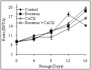 The titratable acidity (TA) increased in the initial days of storage in all treatments. In the control fruits, the maximum peak was observed on the 8th day (0.93 g.100 g-1 citric acid) while on those treated with wax and calcium chloride it was on the 12th day (0.87 and 0.83 g.100 g-1 citric acid), respectively. The combined treatment of beeswax + calcium chloride favored greater stability in the AT content over 16 days (0.82 g.100 g-1 citric acid) differing (p<0.05) in relation to the other treatments (Figure 2C). Fruits treated with beeswax + CaCl2 showed, over 16 days, the lowest ratio of SS/AT ratio (16.61), differing (p<0.05) in relation to fruits treated with wax (18.89) and CaCl2 (19.81), mainly in the control fruits (17.71) whose peak of relation was on the 12thday (Figure 2D).