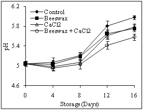 The experiment was conducted in a completely randomized design under a 4x5 factorial arrangement, with four treatments (control, beeswax, calcium chloride and beeswax+calcium chloride) and five storage times (0, 4, 8, 12 and 16 days) with five repetitions and the experimental portion composed of a fruit. The data were submitted to analysis of variance and the means compared by the Tukey test (p<0.05) of probability, with the aid of the statistical program Agroestat.