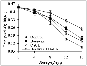The pH values remained unchanged between day zero (4.98) and day 8 (5.03) with no significant difference (p>0.05) between treatments. After this period, a significant increase (p<0.05) is noted until the 16 day of storage when the treatment averages corresponded to 5.98(control), 5.79(calcium chloride), 5.74(wax bees) and 5.58(beeswax + CaCl2) (Figure 2E). The total pectin content (Figure 2F) decreased more significantly after the 4 day of storage, but it remained significantly (p<0.05) higher (0.25 g.100 g-1) in the fruits treated with beeswax + CaCl2 after 16 days in relation to treatments with beeswax, CaCl2 and control (0.16, 0.14 and 0.09 g.100 g-1), respectively.