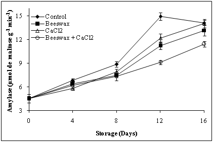 Amylase activity (Figure 3A) increased in all treatments corroborating the reduction in starch content (Figure 2B). In the fruits of the control treatment, the greatest activity occurred on the 12 day (14.96 µmol of maltose g-1 min-1) with subsequent reduction. The fruits treated with beeswax, CaCl2 and their combination did not differ between themselves (p>0.05) until the 8 day of storage, however, after this period the amylase activity remained significantly lower (p<0.05) in fruits immersed in solution of beeswax + CaCl2 until the 16 day (11.45 µmol of maltose g-1 min-1) in relation to the others, suggesting less starch degradation (Figure 2B).